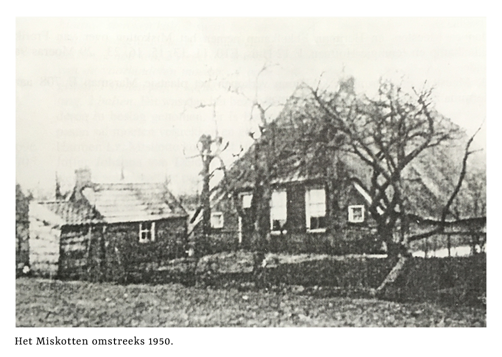 Onze voorouders hadden geen bijnaam maar een huisnaam, die behoort bij een erf of een landerij. De naam is nu nog steeds het “Miskotten”. De naam is mogelijk afkomstig uit het jaar 1583 toen de Roomse mis verboden was. Er werd gekerkt in zogenaamde schuilkerken. Mogelijk werd hier in een Kot (schuur of schaapskooi) de mis bediend. Onze vakantiewoning hebben we daarom “Miskotten” genoemd.